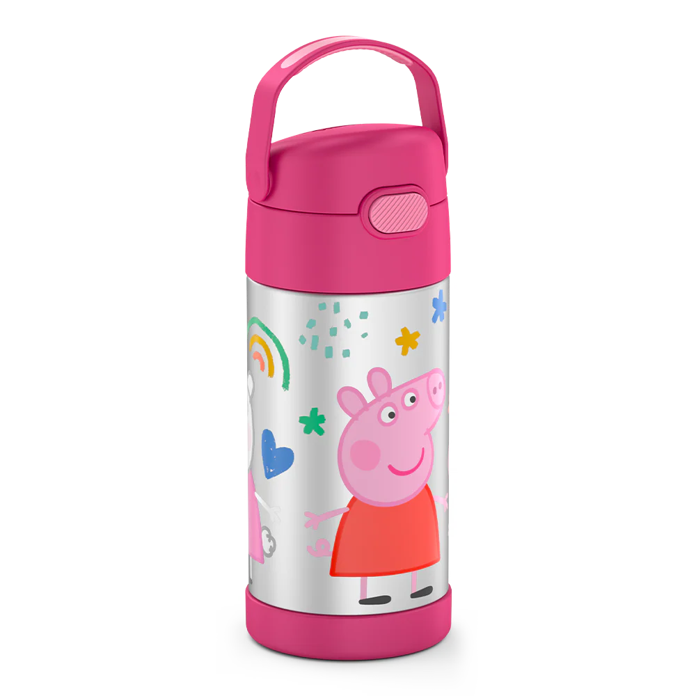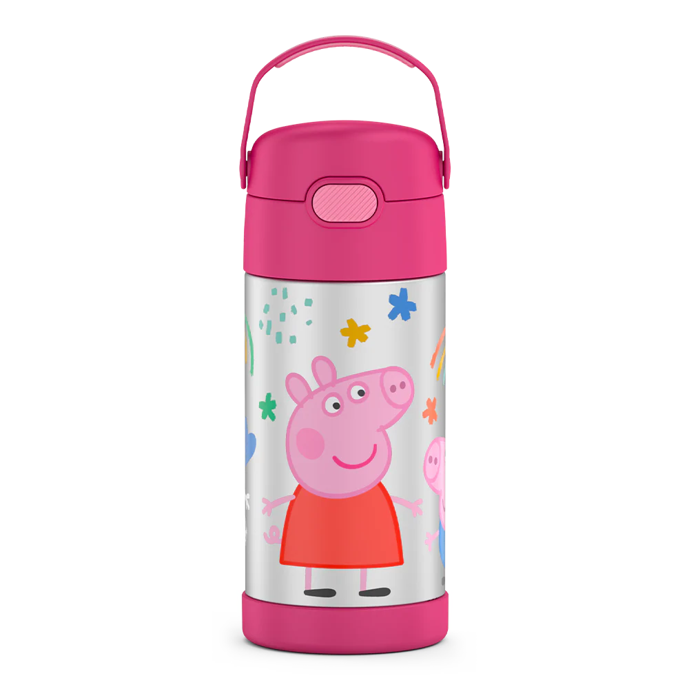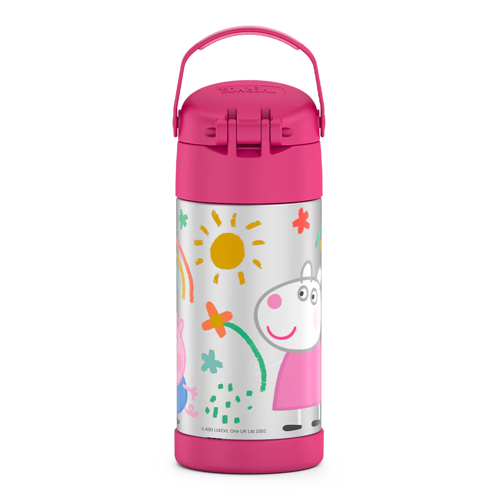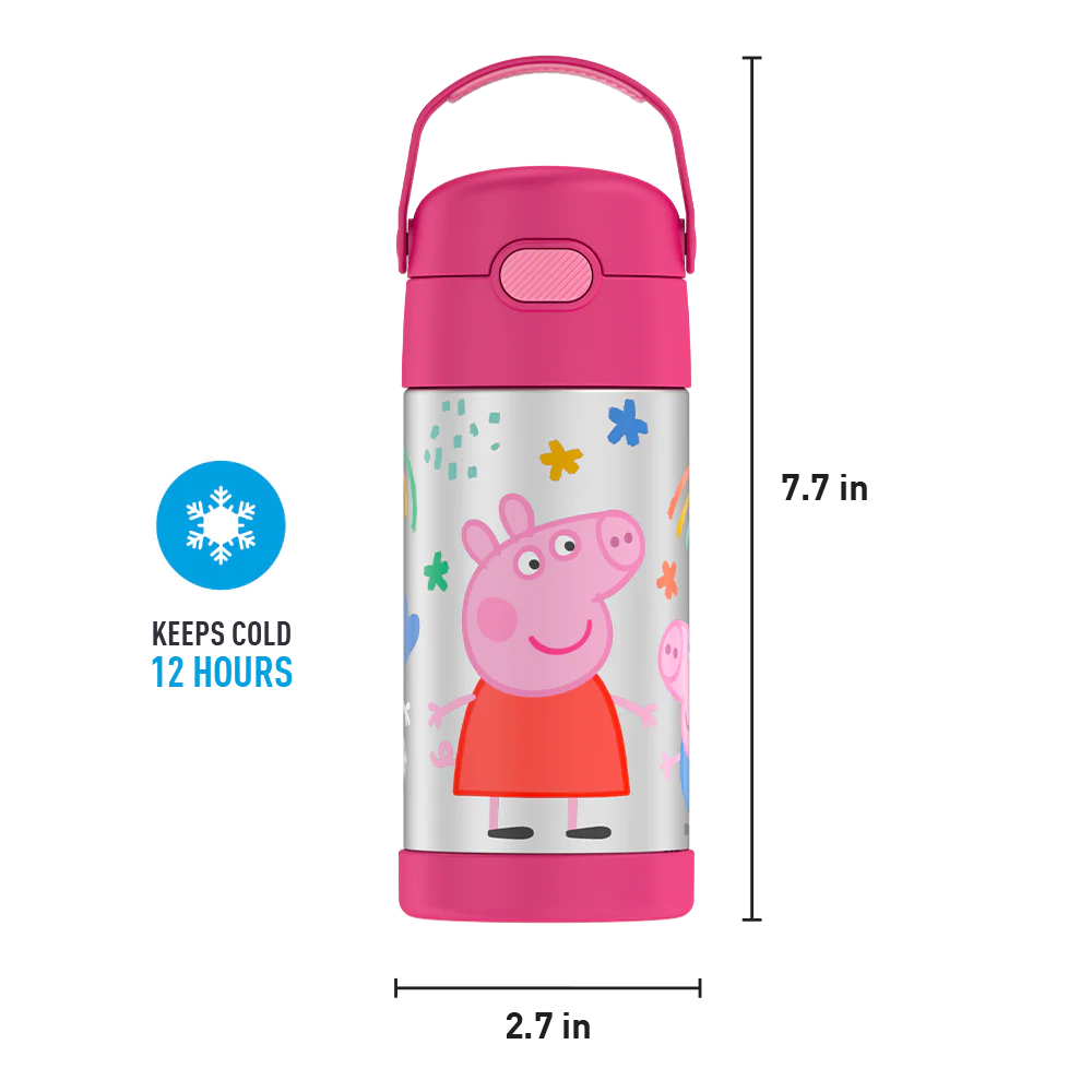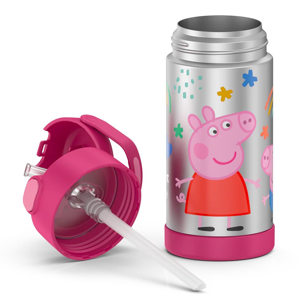 The FUNtainer® 12oz Vacuum Insulated Stainless Steel Water Bottle with Straw keeps drinks cold for up to 12 hours. The double wall stainless steel construction is built to handle drops, dings and assorted roughhousing. Includes an integrated carry handle with soft-touch grip, making it easy for kids to carry with them throughout the day. Help keep germs away with the hygienically covered silicone straw which is removable for easy cleaning. To clean, you can pop your FUNtainer water bottle in the dishwasher; however hand washing is recommended. Not for use with hot liquids.