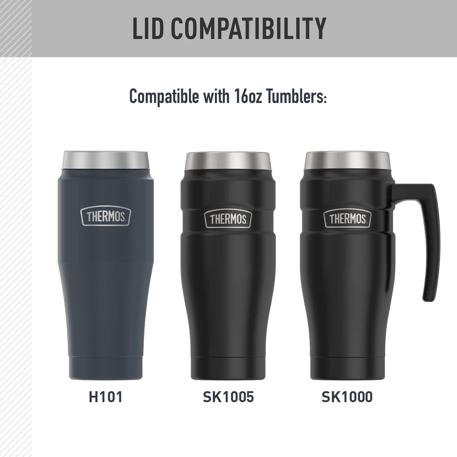 Lost your mug or tumbler lid? No problem. This replacement lid is compatible with the following 16oz. Mug and Tumbler bases: SK1000, SK1005 and H101. Whether you're replacing a lost lid or just need a spare, this lid is designed for a perfect fit and long-lasting durability. The DrinkLock™ sealing lid is leak proof when closed. Dishwasher safe (top rack dishwasher safe for added convenience).
