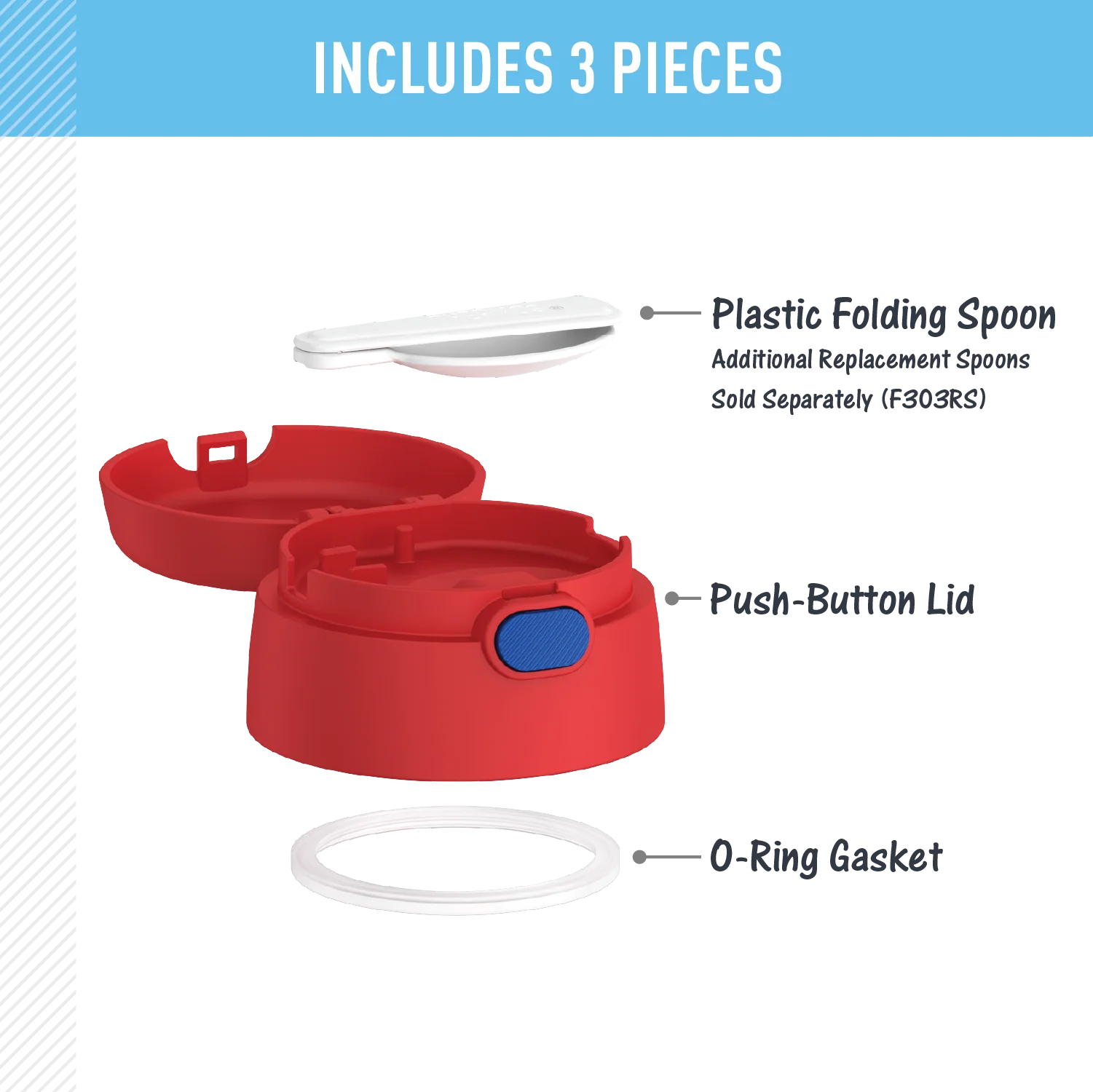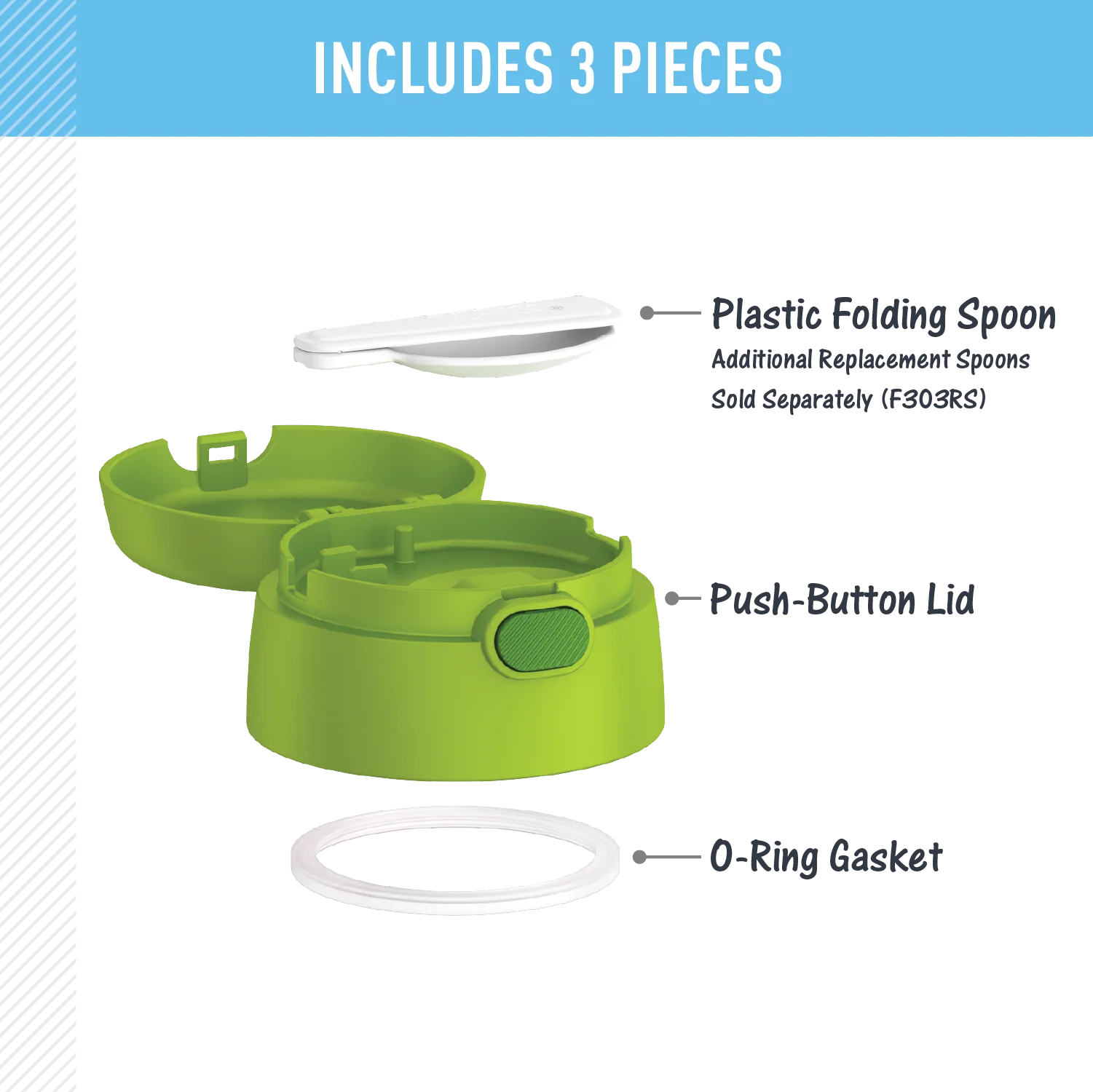 This FUNtainer® Food Jar Lid is a convenient way to replace your current lids. Complete with a folding spoon that is stored inside the lid. To clean, you can pop your lid in the dishwasher; however, washing by hand is recommended. This lid is compatible with F300, F310, F311 + F302/TS301 food jars.